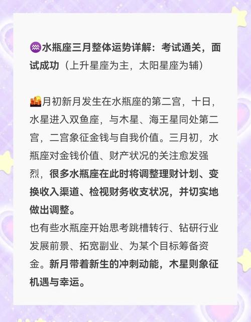 水瓶座在2025年3月的事業(yè)運(yùn)勢整體呈現(xiàn)積極態(tài)勢,以下是對水瓶座三月事業(yè)運(yùn)勢的詳細(xì)分析: