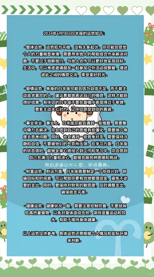 挑戰(zhàn)與機遇并存:白羊座在2024年6月18日的事業(yè)運勢中,雖然整體表現(xiàn)尚可,但也會遇到一些挑戰(zhàn)和機遇。需要白羊座保持積極的心態(tài)和靈活的應(yīng)對策略,以應(yīng)對可能出現(xiàn)的情況。