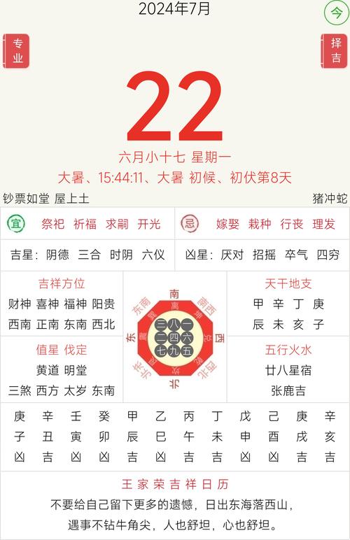 2024年7月22日的黃歷吉兇信息涵蓋了宜忌、吉時(shí)、五行、生肖運(yùn)勢(shì)等方面的內(nèi)容。以下是對(duì)這一天的詳細(xì)分析。