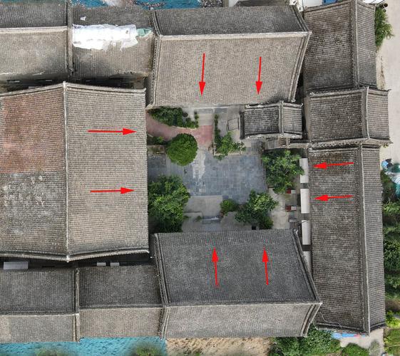 3. 四面坡屋頂:四水歸堂的建筑通常有四面坡屋頂,雨水從四面屋頂流入天井,寓意水聚天心,象征著財(cái)氣的匯集。