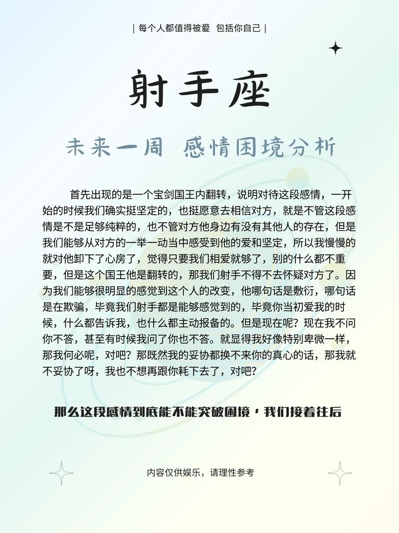 射手座在未來(lái)三天內(nèi)應(yīng)保持開放和理性的態(tài)度,尤其是在處理感情問題時(shí)。避免因情緒化而做出沖動(dòng)的決定。保持冷靜和理性有助于射手座更好地應(yīng)對(duì)感情中的挑戰(zhàn),避免不必要的誤會(huì)和沖突。