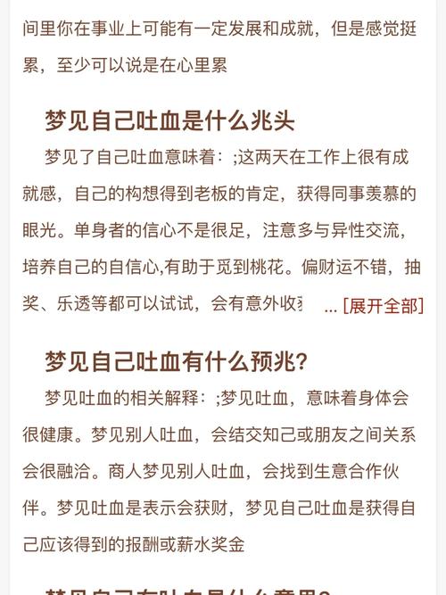 吐血被他人發(fā)現(xiàn):若夢(mèng)中吐血被他人發(fā)現(xiàn),表明夢(mèng)者渴望得到關(guān)注和認(rèn)可。
