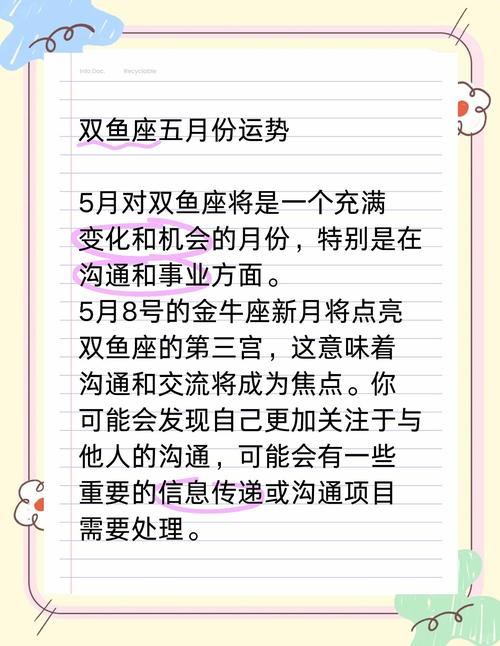雙魚座的各位,五月是一個揚帆起航,乘風(fēng)破浪的月份。你們將迎來新的機遇和挑戰(zhàn),需要做好準(zhǔn)備,把握時機,迎接勝利。