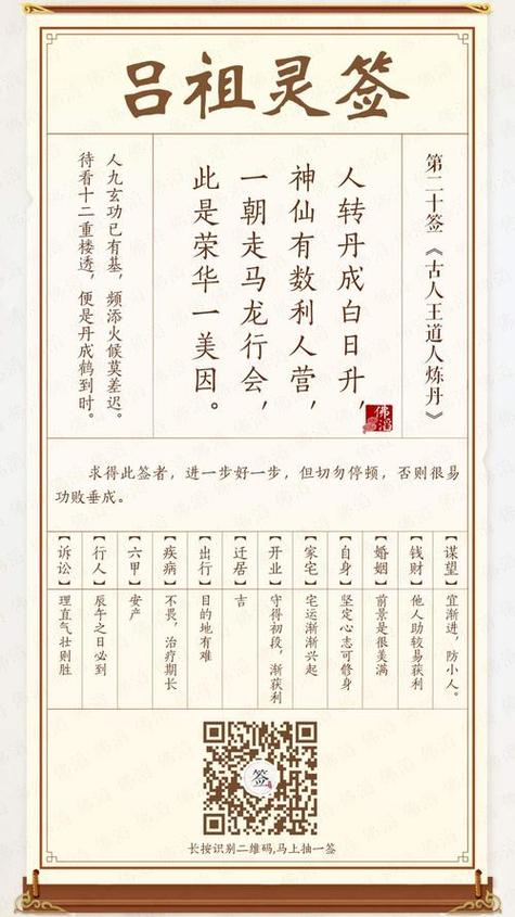 呂祖靈簽的簽文內(nèi)容具有豐富的寓意,每一支簽都蘊(yùn)含著深刻的哲理和指導(dǎo)意義。以下是部分簽文的寓意: