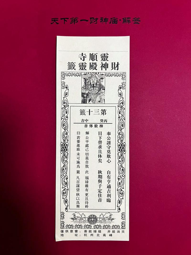 現(xiàn)代社會(huì)中,財(cái)神殿靈簽不僅用于宗教和精神指引,還被應(yīng)用于預(yù)測財(cái)運(yùn)、事業(yè)和生活的各個(gè)方面,幫助信徒在復(fù)雜多變的生活中做出明智的決定。