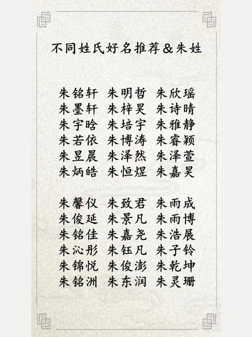 男孩:朱威(威嚴(yán)王者)、朱霸(霸者氣概)、朱峰(山林之王)、朱勇(勇敢果斷)、朱權(quán)(權(quán)勢威嚴(yán))、朱魁(魁梧壯實(shí))、朱翰(文武兼?zhèn)洌?/p>