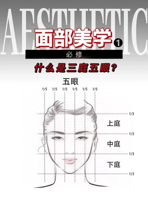 三庭五眼是面部黃金分割的一個重要應(yīng)用,將臉部縱向分為三個等分(上庭、中庭、下庭),橫向分為五個等分(兩眼之間、眼內(nèi)側(cè)、眼外側(cè)、眼外側(cè)至顴骨、顴骨至頦部),各占臉長的1/3和臉寬的1/5。