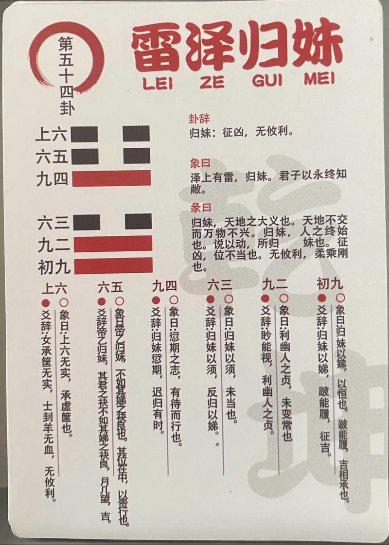 歸妹卦是《易經(jīng)》六十四卦中的第五十四卦,象征少女出嫁,代表婚姻與情感的結(jié)合。以下是歸妹卦六爻辭的詳細(xì)解釋: