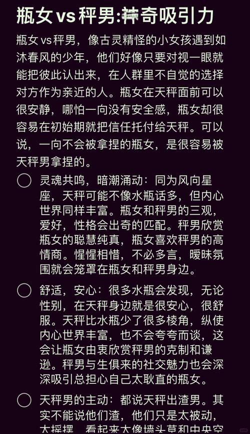 相互吸引:水瓶座和天秤座都是風(fēng)象星座,具有獨立、理性、開放的特點。水瓶座的獨特見解和創(chuàng)造力吸引著天秤座,而天秤座的優(yōu)雅和溫和也深深吸引著水瓶座。