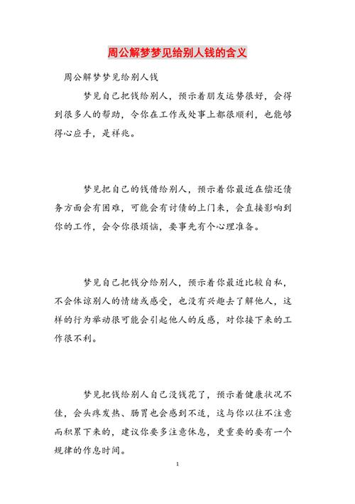 在周公解夢(mèng)中,夢(mèng)見親人贈(zèng)送錢財(cái),往往寓意著吉兆和好運(yùn)。公公代表著長(zhǎng)輩和權(quán)威,因此夢(mèng)見公公給錢,可能有以下幾種含義:
