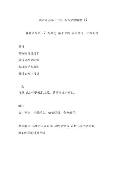 觀音靈簽第17簽是觀音靈簽中的一支中簽,簽詩(shī)為“莫聽(tīng)閑言說(shuō)是非,晨昏只好念阿彌。若將狂話為真實(shí),畫(huà)餅如何止得饑?!贝撕炏笳髦?huà)餅充饑,提醒人們不要被虛妄的言論所迷惑,要專注于實(shí)際行動(dòng)和真實(shí)成果。