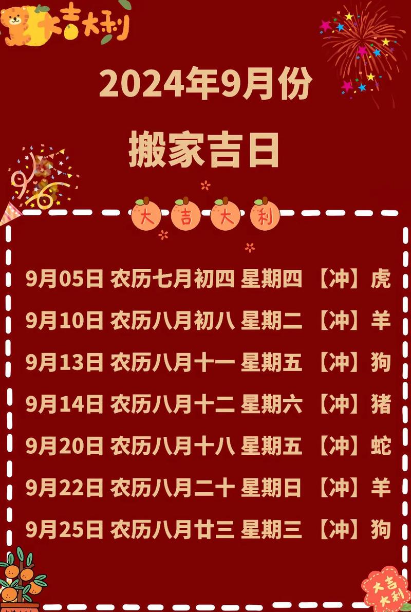 選擇吉日進行店搬遷在中國傳統(tǒng)文化中是一種重要的習俗,旨在趨吉避兇,為新店鋪帶來好運和順利。以下是2024年9月適合店搬遷的黃道吉日和相關(guān)注意事項。