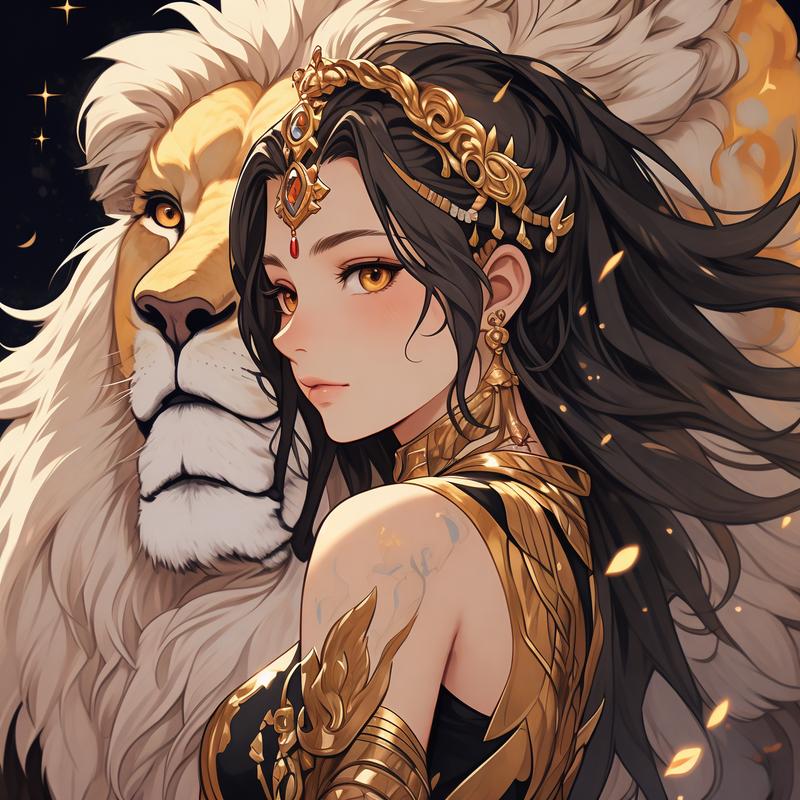 女頭像,頭戴精致的鳳冠,身著華貴的長裙,儀態(tài)萬方,雍容華貴。胸前的獅子座符號,象征著她的高貴與尊嚴(yán)。背景是一座金碧輝煌的宮殿,處處透露出皇室的威嚴(yán)與氣派。