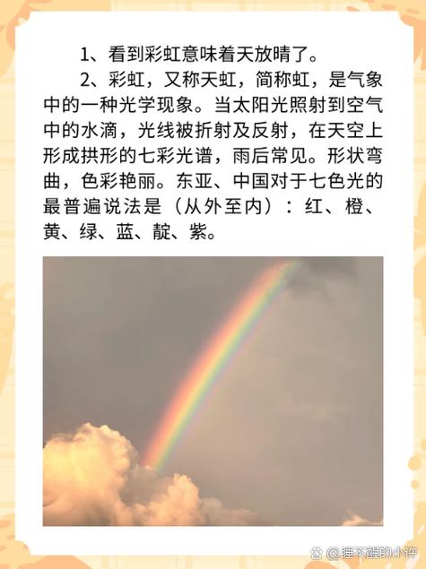 彩虹是一種美麗而獨(dú)特的自然現(xiàn)象,它以其絢麗的色彩和神秘的出現(xiàn)方式,被賦予了豐富的寓意和象征意義。以下是對(duì)彩虹寓意和象征意義的詳細(xì)探討: