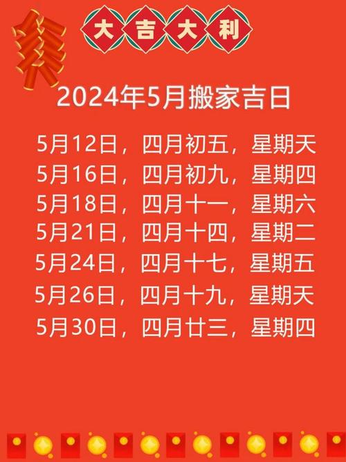 選擇喬遷吉日在中國傳統(tǒng)文化中非常重要,被認(rèn)為可以帶來好運和順利。2024年五月份有幾個適合喬遷的吉日,以下是一些推薦的日期及相關(guān)注意事項。