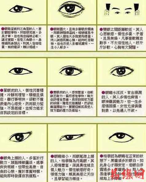 其他特征:眼神堅定,具有神采,表明意志堅強,有遠見。如果眼白過多,可能被認為缺乏道德觀,性格叛逆,難以屈服于他人。