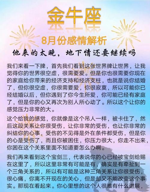 2024年8月,金牛座在感情方面既有桃花運(yùn)和浪漫的機(jī)會,也面臨一些中期挑戰(zhàn)。單身的金牛座應(yīng)積極參與社交活動,展現(xiàn)魅力;有伴侶的金牛座需加強(qiáng)溝通和理解,共同成長。通過理性應(yīng)對挑戰(zhàn)和抓住機(jī)遇,金牛座的愛情生活將迎來更加穩(wěn)定和幸福的發(fā)展。