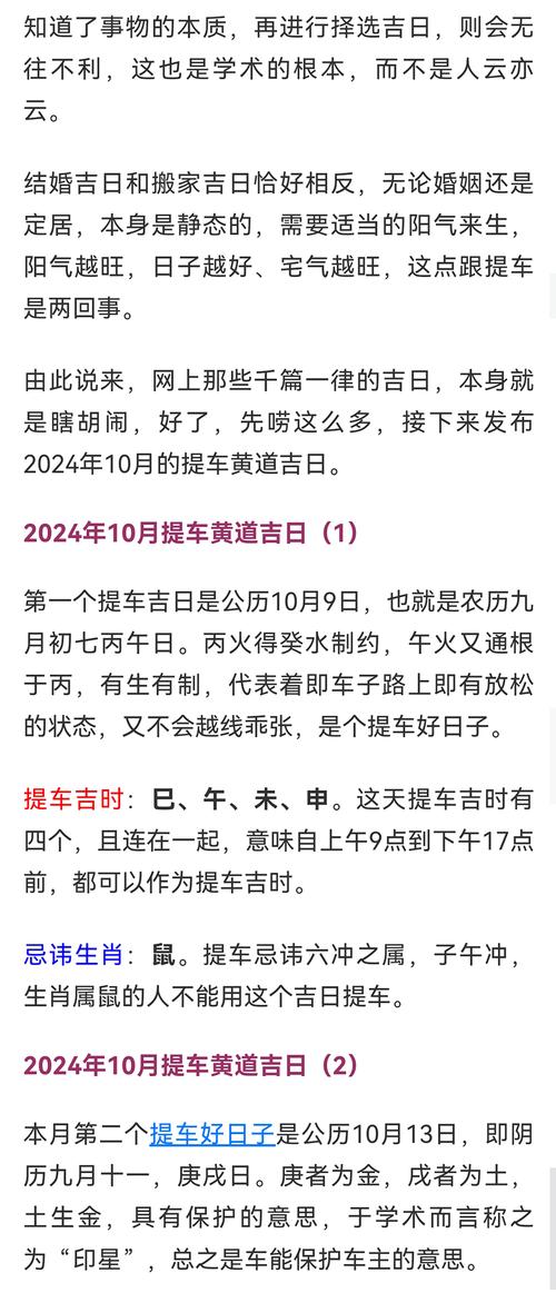 選擇提車的吉日是許多車主在購車時考慮的一個重要因素,尤其是在中國文化中,吉日象征著好運和平安。以下是2024年10月適合提車的吉日和相關(guān)注意事項。
