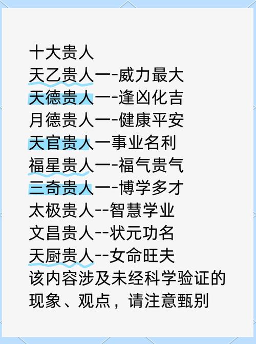 1. 天乙貴人:天乙貴人被視為命中的吉神之首,具有逢兇化吉的能力。在危難之時,天乙貴人能夠給予幫助,化解災(zāi)難,使命主轉(zhuǎn)危為安。天乙貴人的出現(xiàn)如同黑暗中的明燈,為命主照亮前行的道路。