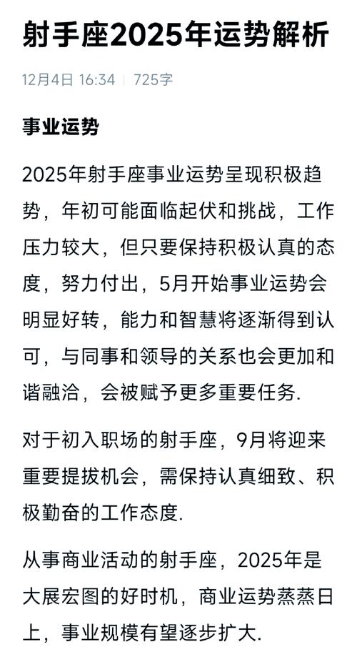 2025年射手座的工作和事業(yè)運(yùn)勢(shì)整體呈現(xiàn)上升趨勢(shì),但也伴隨著一些挑戰(zhàn)。以下是對(duì)2025年射手座工作和事業(yè)運(yùn)勢(shì)的詳細(xì)分析: