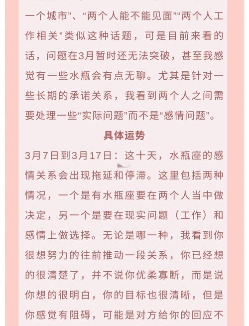 溝通的重要性:水瓶座需要珍惜這個(gè)充滿浪漫與深情的時(shí)期,勇敢地追求自己的愛情,同時(shí)也要學(xué)會(huì)珍惜眼前的感情,用心經(jīng)營和維護(hù)。
