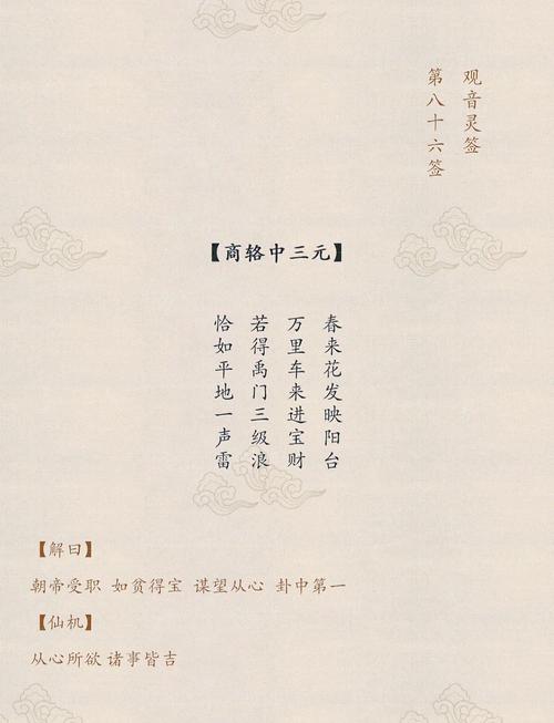 這一簽屬于中簽,寓意著在追求目標的過程中可能會遇到一些阻礙和困惑,但只要保持冷靜,尋求智慧和貴人的幫助,就能夠找到解決問題的方法,最終實現(xiàn)自己的愿望。