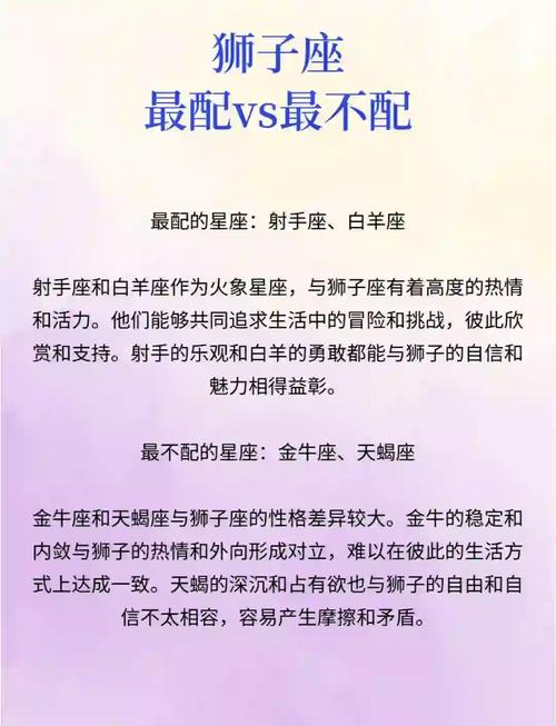 獅子座與白羊座、射手座、天秤座、摩羯座、雙子座、巨蟹座等星座都比較合拍,這些星座與獅子座在性格、價值觀和興趣愛好上都有較高的契合度。以下是獅子座與這些星座合拍的原因: