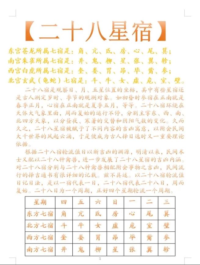二十八宿吉兇口訣歌在中國傳統(tǒng)文化中有著深遠(yuǎn)的影響,不僅在古代文獻(xiàn)中廣泛記載,還在民間信仰和日常生活中得到廣泛應(yīng)用。這些口訣作為文化傳承的一部分,展示了古代中國人對宇宙和人生的理解和敬畏。
