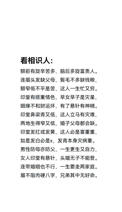 看面相是一門博大精深的學(xué)問,通過觀察面部特征,可以了解一個人的性格、運勢和其他信息。雖然面相并不能完全決定一個人的命運,但可以提供一些參考和預(yù)測,幫助我們更好地了解自己和他人。