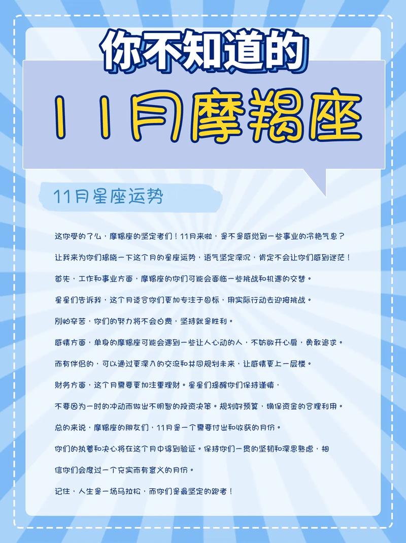 挑戰(zhàn)與機(jī)遇:摩羯座在11月可能會(huì)遇到一些強(qiáng)勁的競(jìng)爭(zhēng)對(duì)手或挑戰(zhàn),需要保持冷靜與理智,從挑戰(zhàn)中尋找機(jī)遇,提升專業(yè)技能與團(tuán)隊(duì)協(xié)作能力。