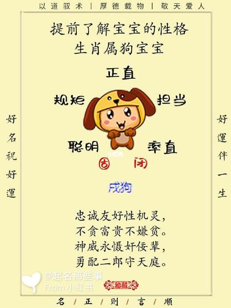 狗年出生的人,地支為戌,五行為土。戌土代表著忠誠、正直、勇敢、責任感強。在起名時,可以從以下幾個方面考慮生肖特性: